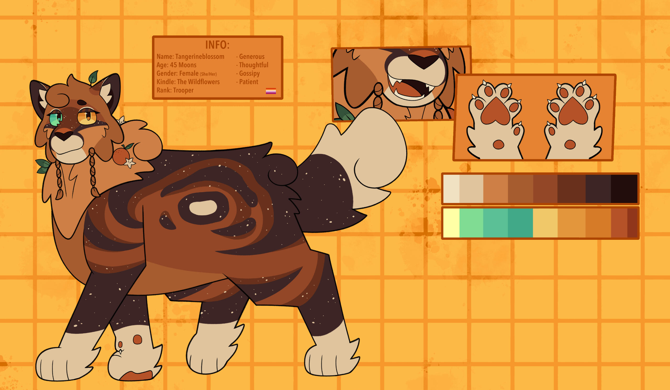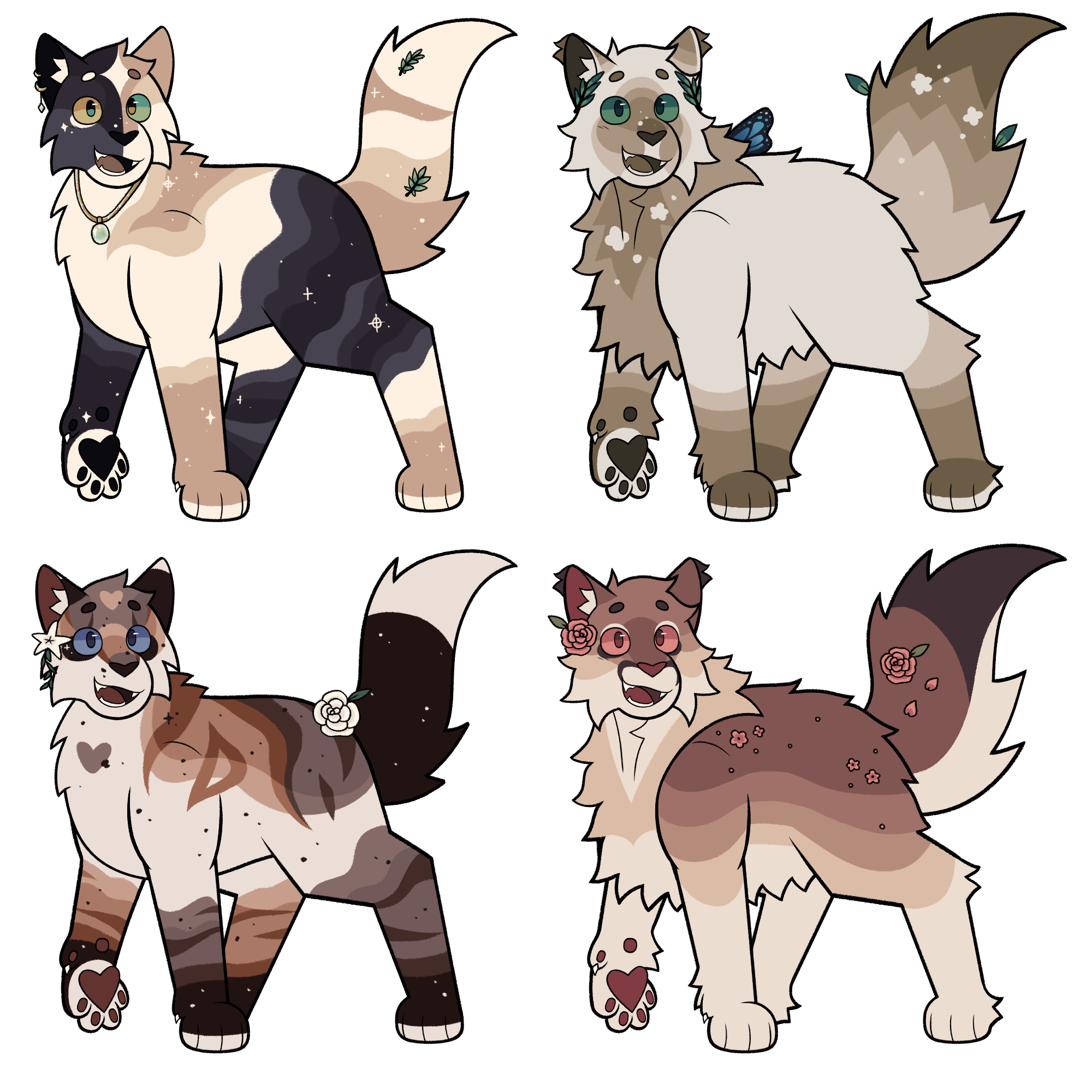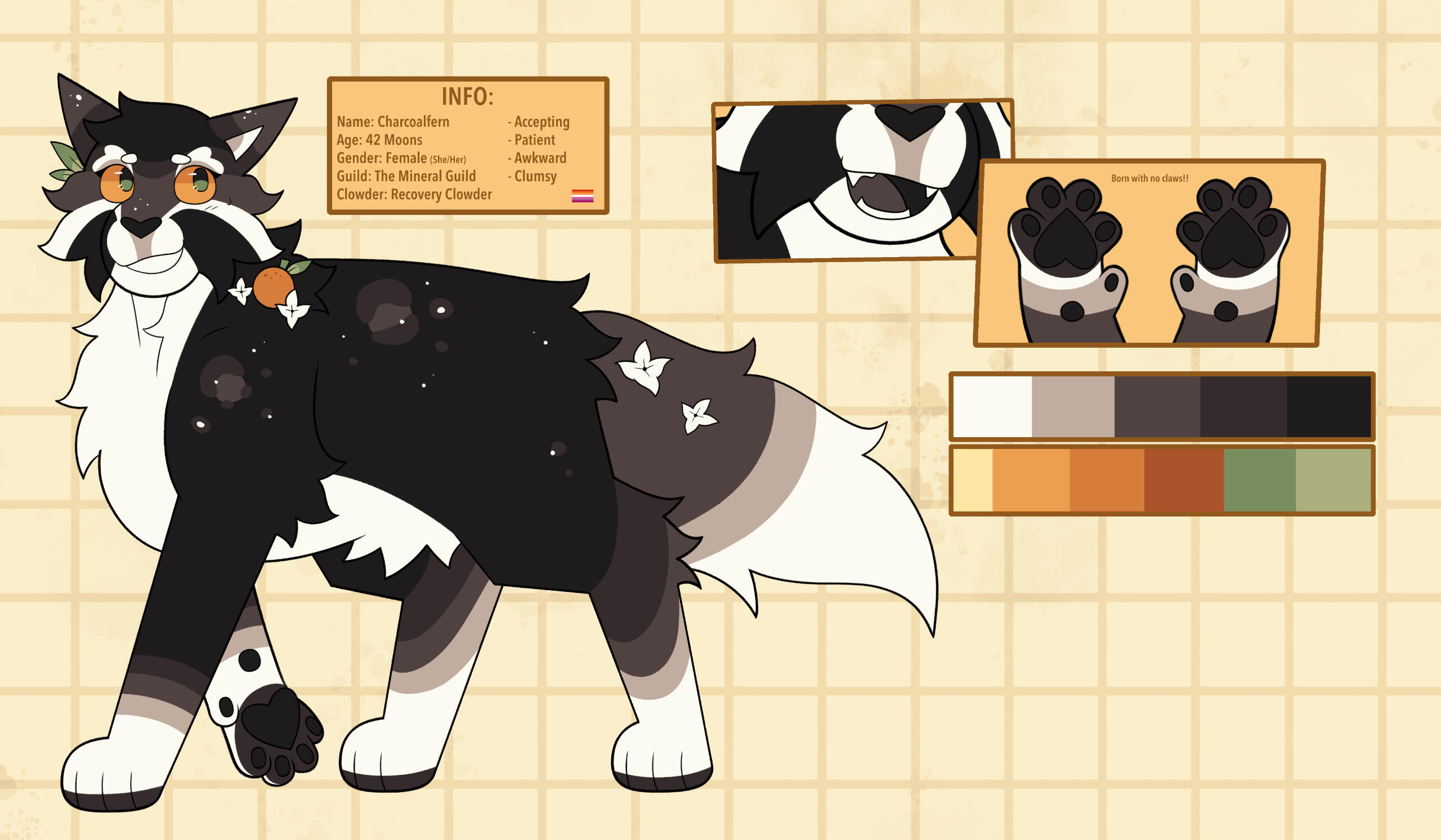£50 - Complex Reference Sheet; includes a fullbody, two expression sketches, a turnaround, close ups of paws, mouth, and eyes, colour palette and basic info, along with optional flowers around the ref.